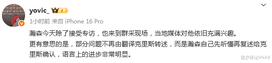 开拓者另外一名记者“yovic”发文表示:瀚森今天除了接受专访,也来到群采现场,当地媒体对他依旧充满兴趣。
